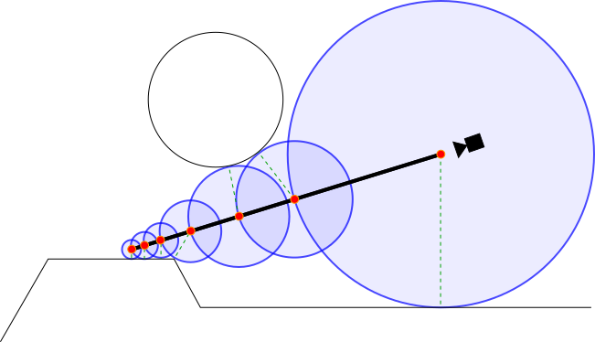 Each voxel has its color and density value according to the ray from a certain camera view, modeled as circles along a ray in the above image. If the voxel is in free space, the density would be close to 0. However, if the voxel represents an object, the density would be higher, and we could see the color in the rendered 2D image. To render the 2D image, rays from the camera perform ray marching, which is where along each step of the ray, a sine distance function is calculated to find the distance to the nearest object (voxel with a density above a certain threshold). This calculation continues down the ray until the distance is below a certain threshold. By sampling the radiance function along the ray, the model can determine the density and color of the pixel. By continuously doing this each iteration with randomly selected points, views, and rays, the model can improve its function weights.