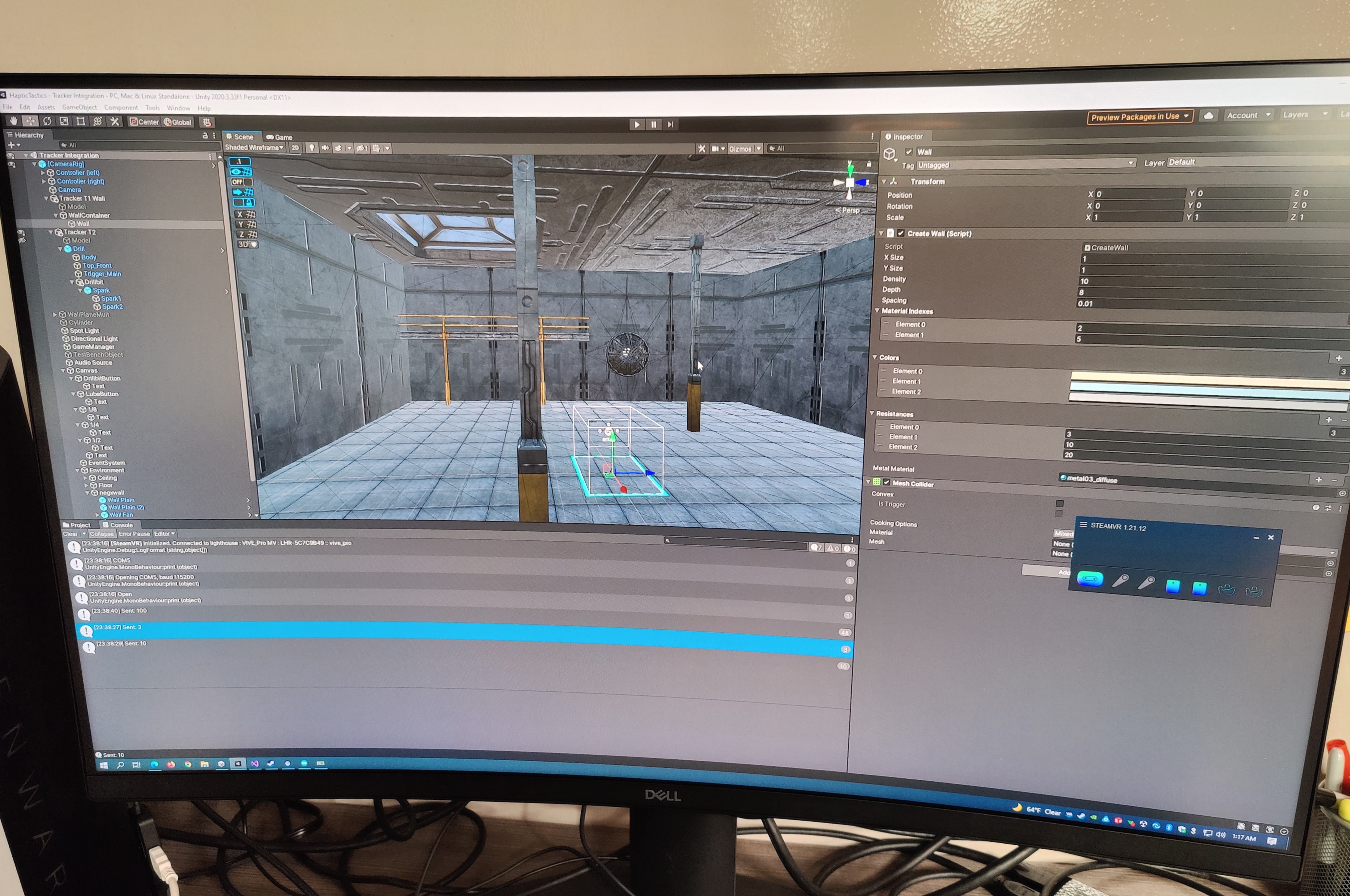 The drill target is a procedurally generated multi-layered mesh. I programmed the material so that when the user drills this target, a hole is created with convincing effects that the user is actually drilling. Additionally, the drill proxy would engage its haptic feedback according to which layer (material) the user was drilling. Audio feedback was also provided to the user to simulate the drilling sound. Below is a picture of my development on the Unity environment.