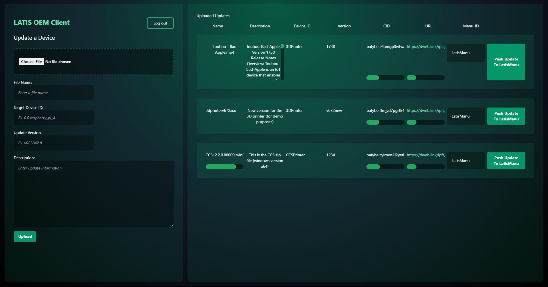 The OEM Screen has a component where they can upload a file to Filecoin through Estuary. They can also see all the current updates they have that are uploaded, and can notify the manufacturer of a new update. All of these transactions are done through smart contracts, so that the OEM can’t just upload a malicious file and send it to the manufacturer, and no one can tamper with the file or notifications once it’s uploaded. We used OpenZepplin for permission security.