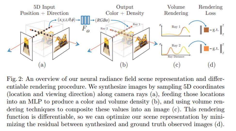 What this function is doing is grabbing the respective 3D voxel’s color and density (the opacity) given the camera’s viewing angle. A voxel is an infinitesimally small 3D cube in space. To evaluate this function’s weights, the output at rendered views across multiple views is compared to the ground truth 2D views. The loss is calculated with a total squared error between the rendered and true pixel colors. Using gradient descent for the MLP function, the weights Θ are optimized to map each 5D input coordinate to the corresponding volume density and directional emitted color of a 3D space. From the paper: