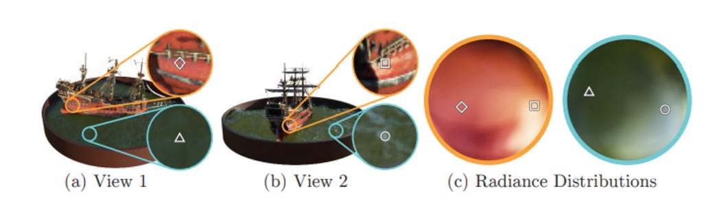 An interesting thought is that light sources and rays in these NeRF representations are not actually rays as we may think in 3D rendering — we are only looking at the radiance off of objects, with light only changing the effect of the pixels like a 2D layer.