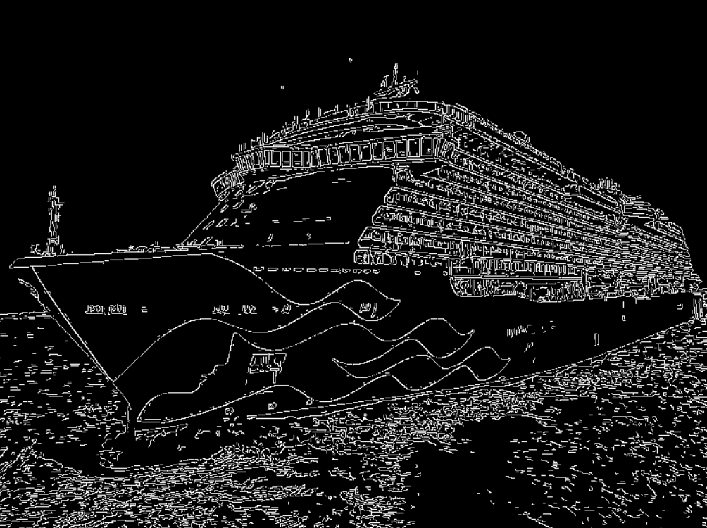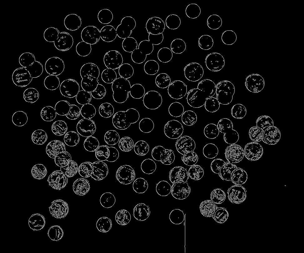For Canny Edge Detection, I took in a PPM image of the coins, converted it to grayscale, and applied Gaussian filters to smooth the image from noise. Using the Sobel Operator, I could then detect contrasting changes in the image signal, which usually meant an edge. However, there is still a lot of noise in the image, so I then used non-max suppression to remove the noise. Finally, I used hysteresis to remove the weak edges. Here is an example of my Canny Edge Detection output given an image:
