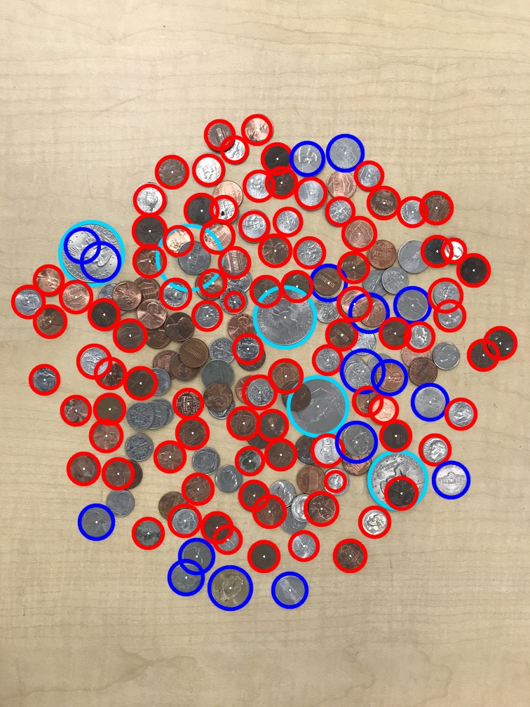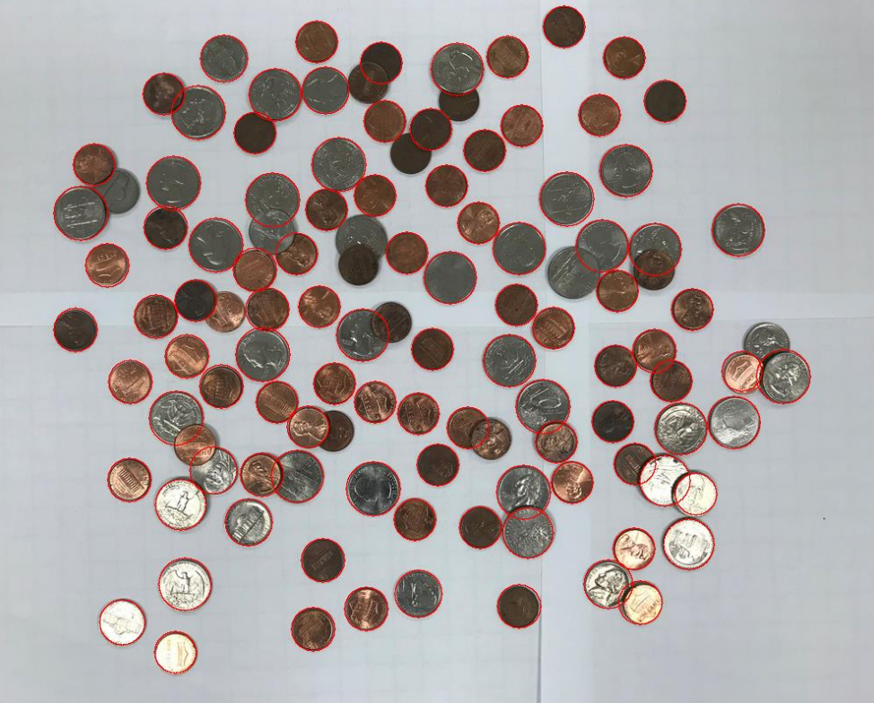 I then needed to detect the circles in the image. I used the Hough Transform to detect the circles by drawing various radius circles at each pixel of an edge in the image. By accumulating the circles, I could detect which pixels represent the centroids of the circles, since they would have the highest intensity of overlap. I could then draw the circles on the image and detect the coins. Here is an example of the circles I detected in red: