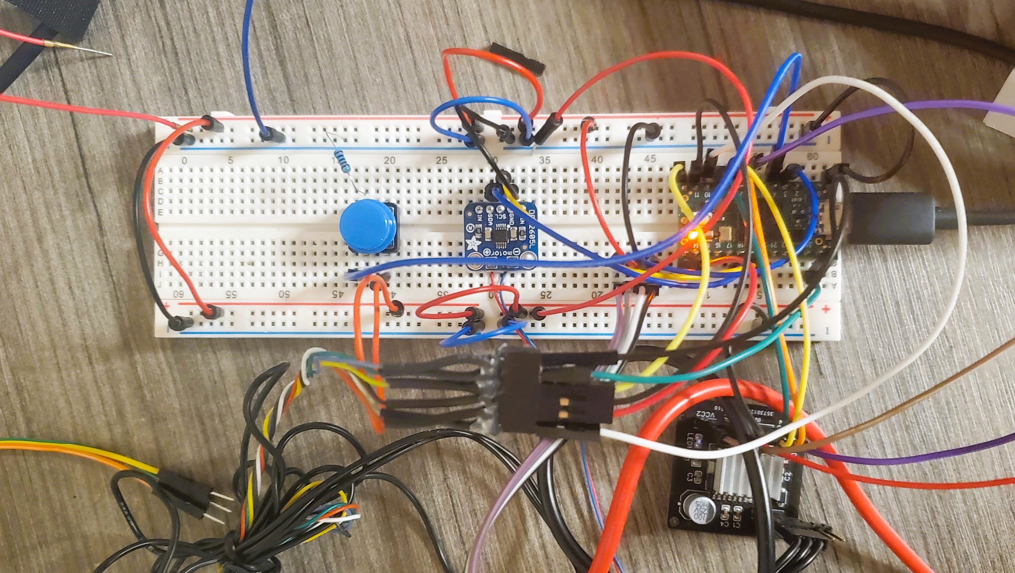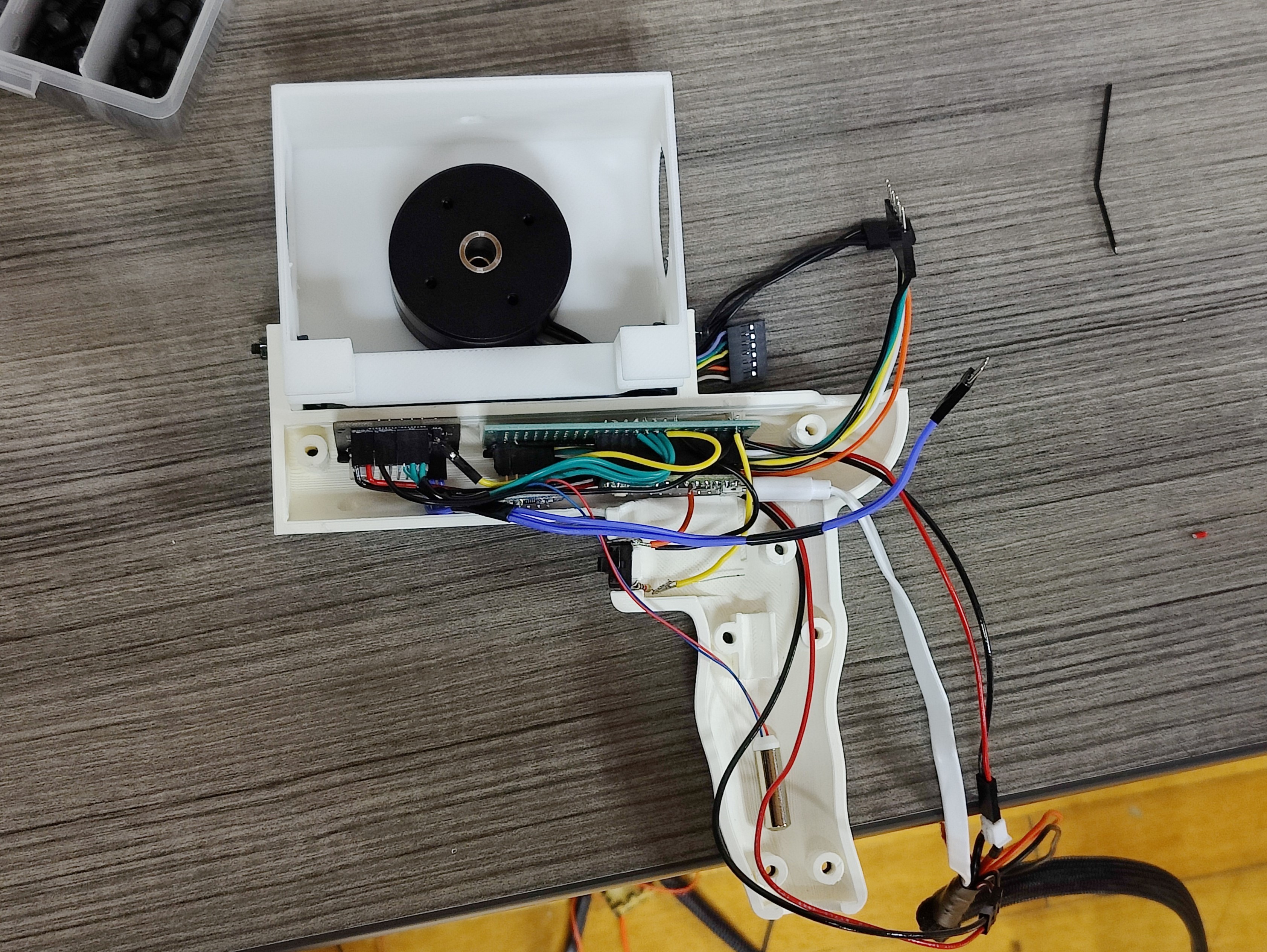 A Teensy 4.0 microcontroller was used as a middleman between the host computer and the other motor controllers. It received commands from the host computer through UART and relayed the force feedback commands to the BLDC motor controller and the vibration commands to the vibromotor. It also sent the button press and toggle switch states to the host computer. I controlled the BLDC’s resistance through modifying the SimpleFOC library and current-based PID control according to the value sent by the host computer, providing a customizable linear resistance which represented different drilling materials. We also attached two fans to the drill to provide cooling for the BLDC. Below is an image of the drill circuit during testing.