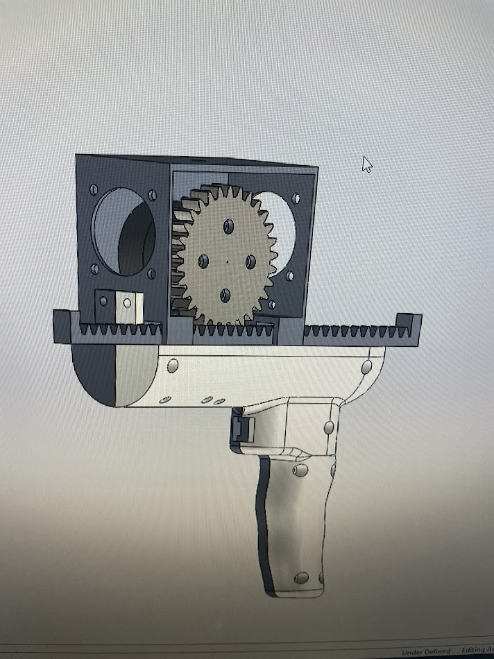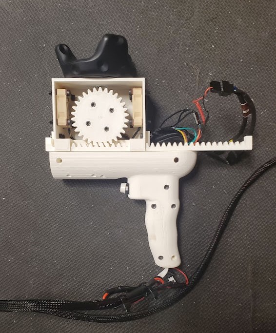 The drill proxy was modeled in SolidWorks and printed in PLA. We used a rack and pinion to transform the rotational torque provided by the BLDC into linear force feedback. The handle of the drill is hollow, allowing us to insert our PCB boards, wires, and vibromotor.