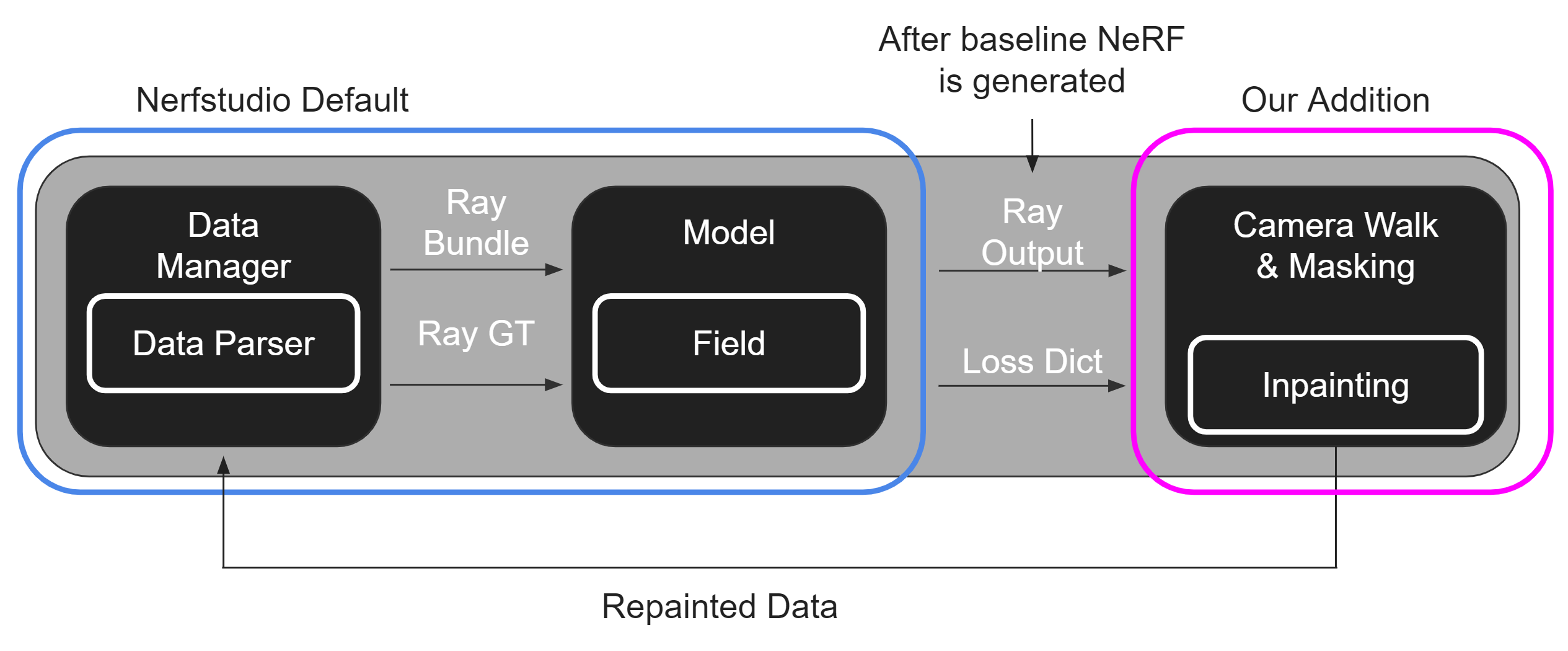 In NeRFStudio, we implemented a camera walk method that stochastically moves a camera around the NeRF to generate new views according to the NeRF’s normals at a certain point. This allows for more controlled and accurate camera placement.